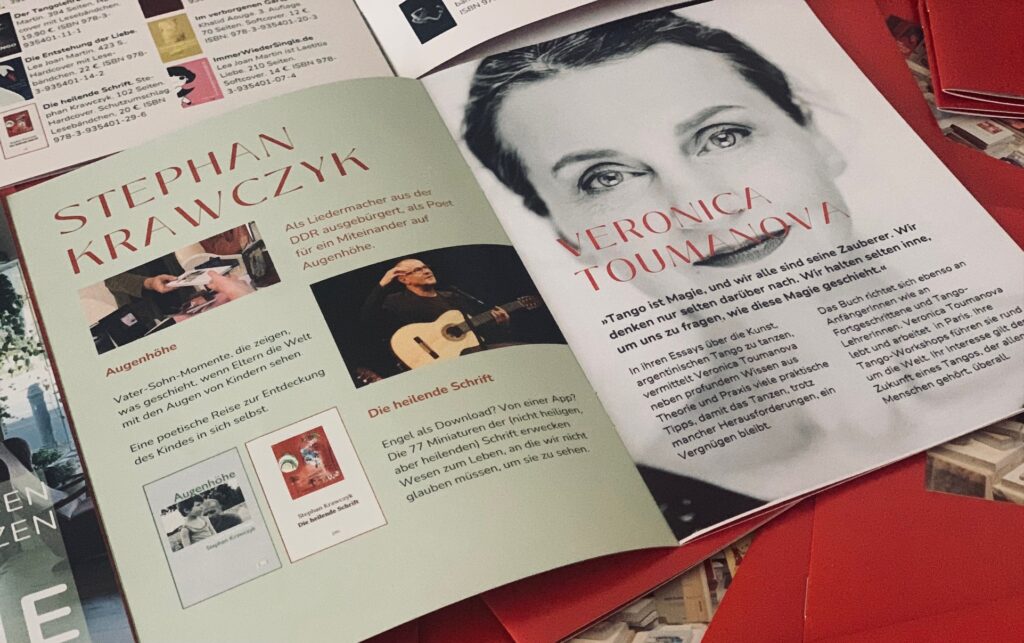 Herbst 2024 Ab sofort wieder lieferbar: Stephan Krawczyks Erzählung aus seinem Leben als alleinerziehender Vater »Augenhöhe«. Ebenso die Berliner Kolumnen »Tango Dreams« von Lea Martin. Für alle, die (vielleicht sogar erstmals) Tangoluft schnuppern wollen. Hardcover mit rotem Lesebändchen, Ideal auch als Geschenk.